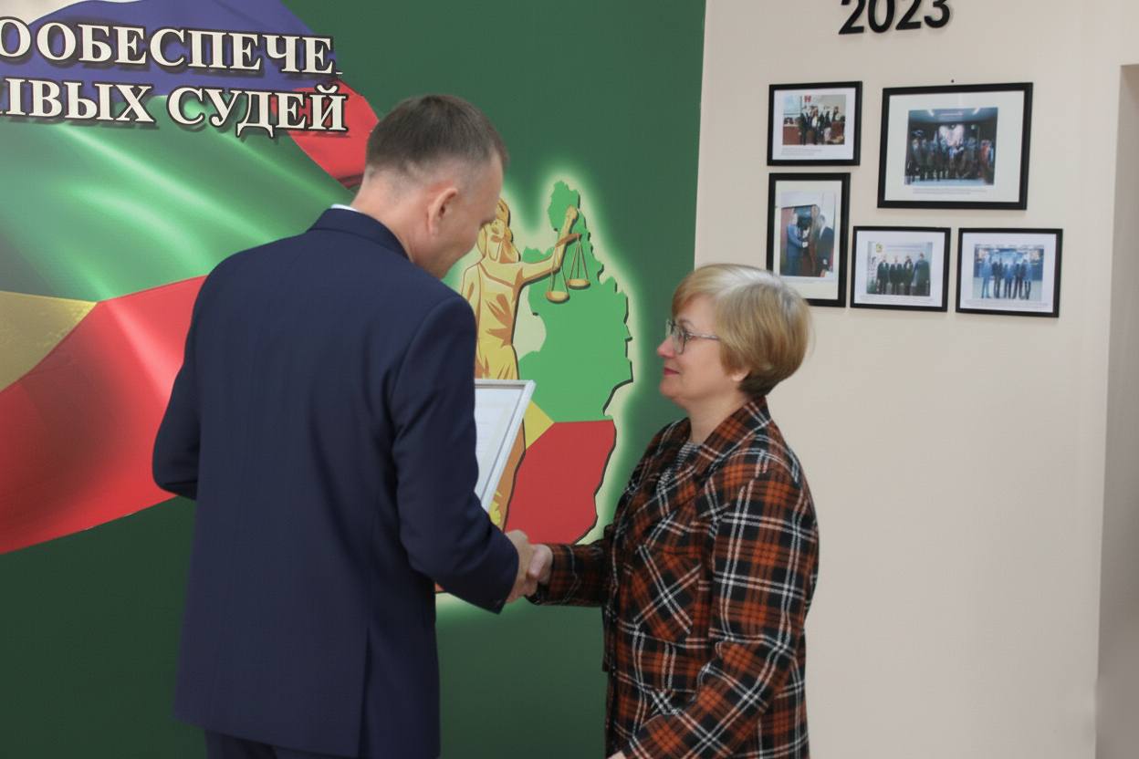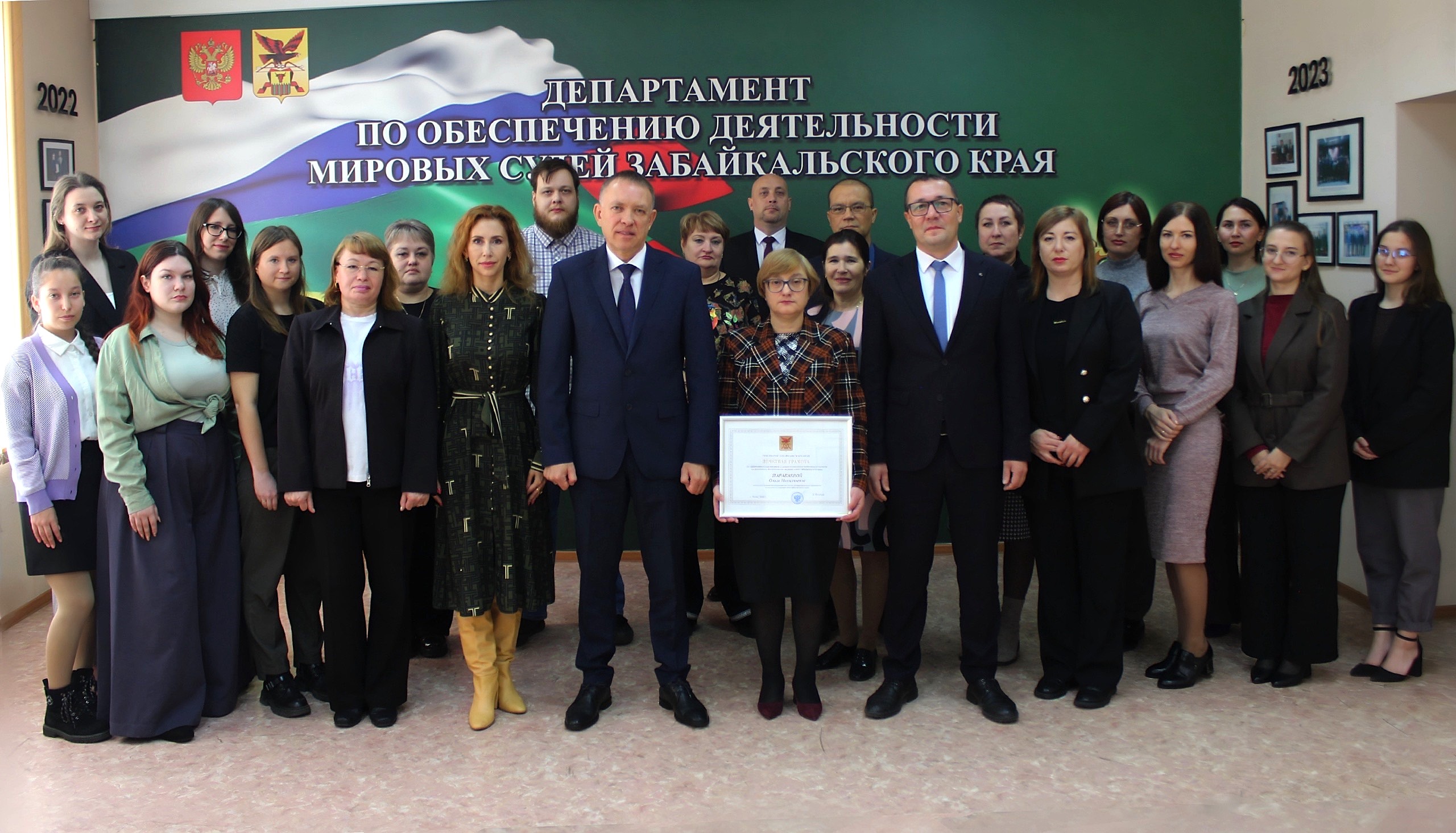 По поручению Губернатора Забайкальского края Александра Осипова руководитель Департамента обеспечения деятельности мировых судей Забайкальского края Альберт Трофимов вручил почётную грамоту губернатора Забайкалья начальнику финансово-экономического отдела Ольге Шарабаевой за эффективную организацию и совершенствование бюджетного процесса профильного ведомства.