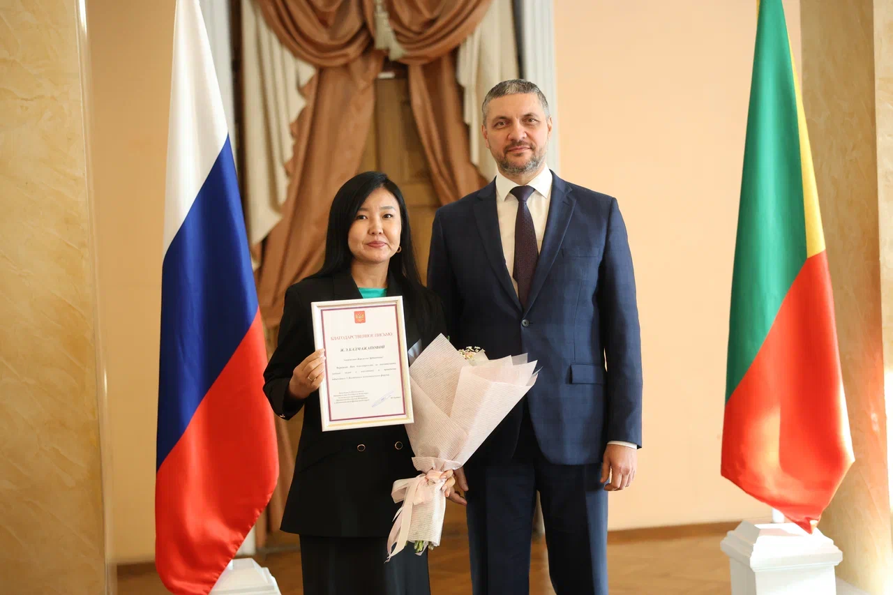 Благодарственное письмо Заместителя Председателя Правительства Российской Федерации – полномочного представителя Президента Российской Федерации в Дальневосточном федеральном округе Юрия Петровича Трутнева Александр Осипов вручил министру экономического развития Забайкальского края Жаргалме Бадмажаповой.